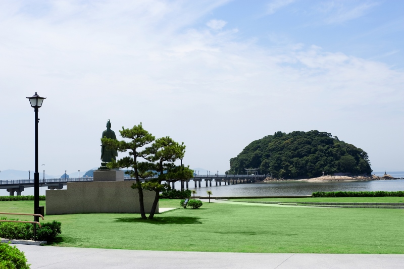 島の中央部には、日本七弁財天のひとつであり、開運・安産・縁結びの神としても知られる「八百富神社」があります。島の周囲には30分程で廻れる遊歩道があり、海と島の両方の景色が楽しめます。 4月上旬から6月下旬には竹島海岸で潮干狩も楽しめます。